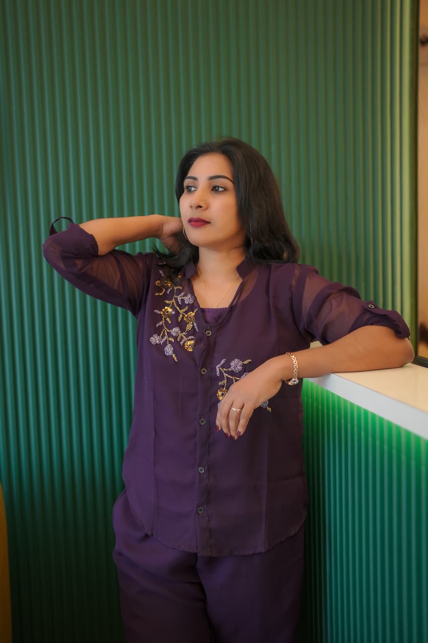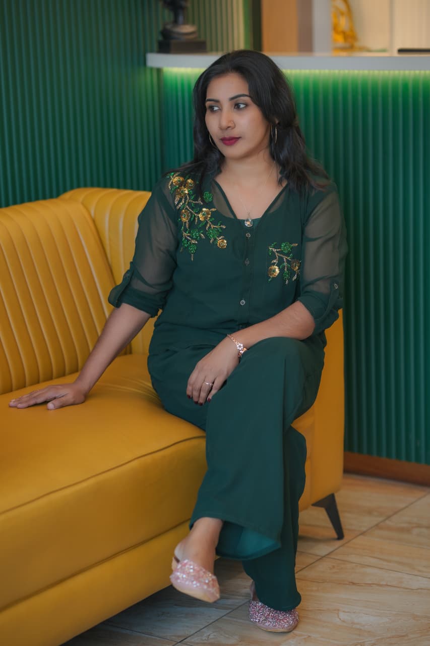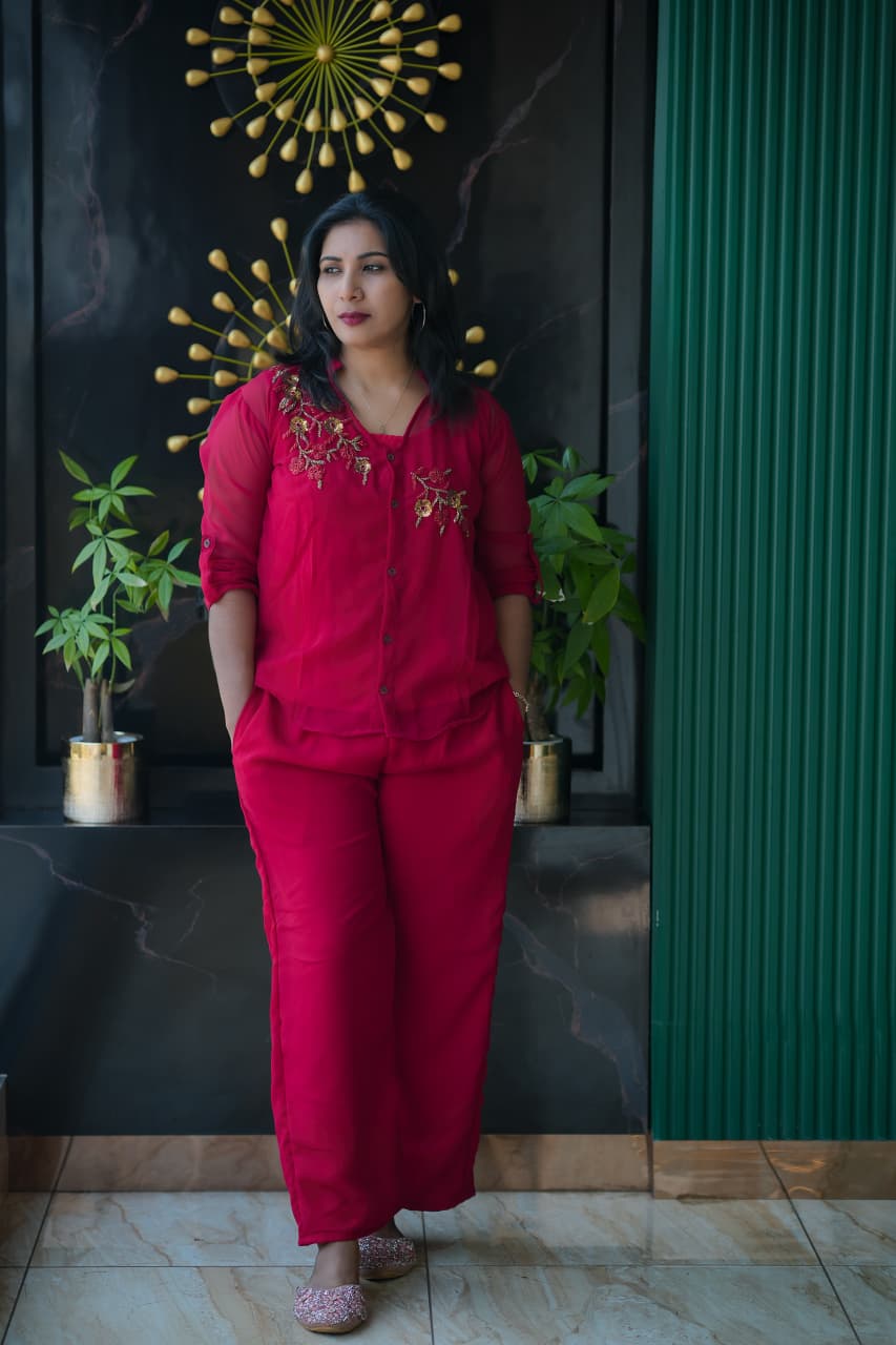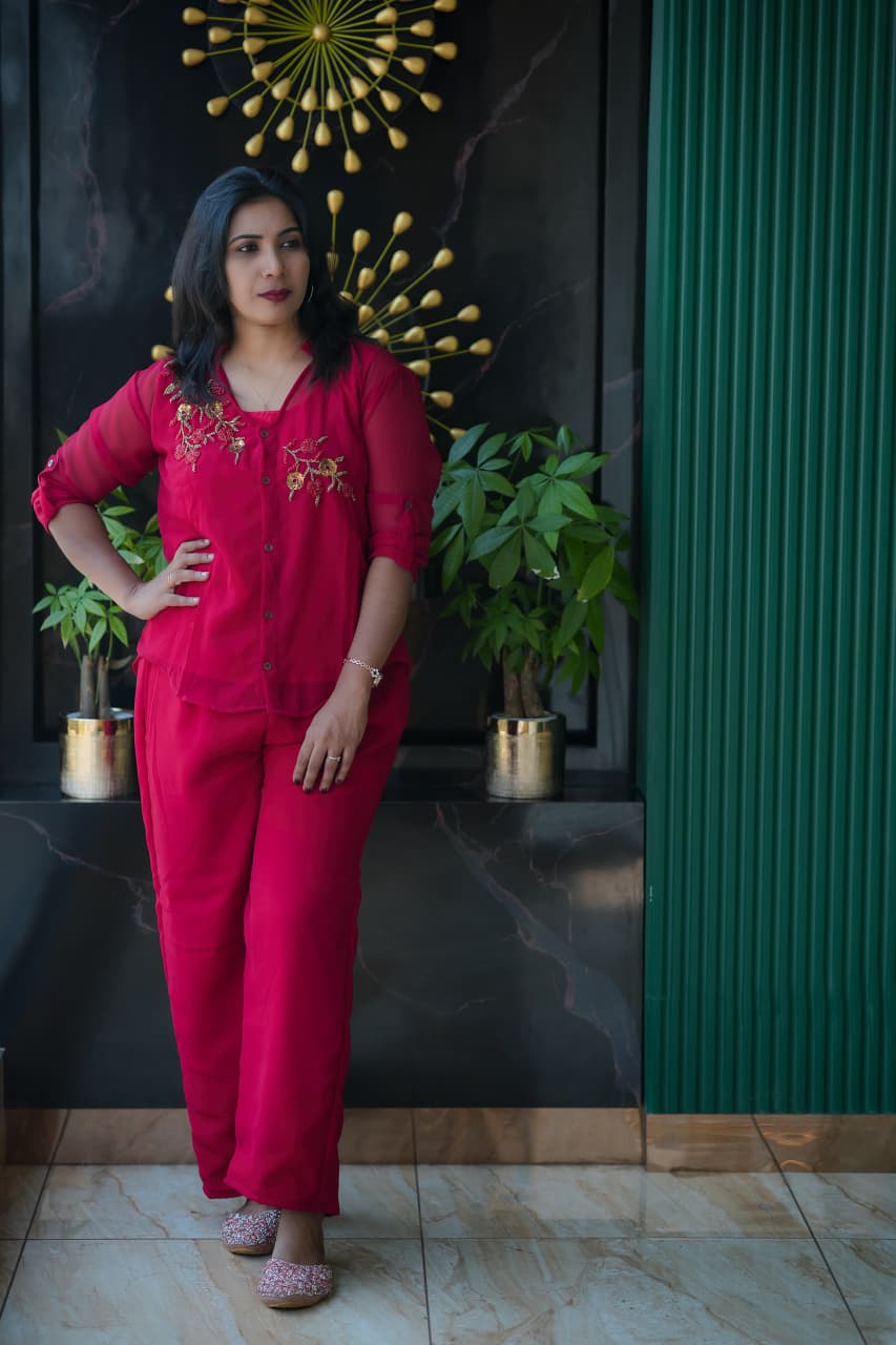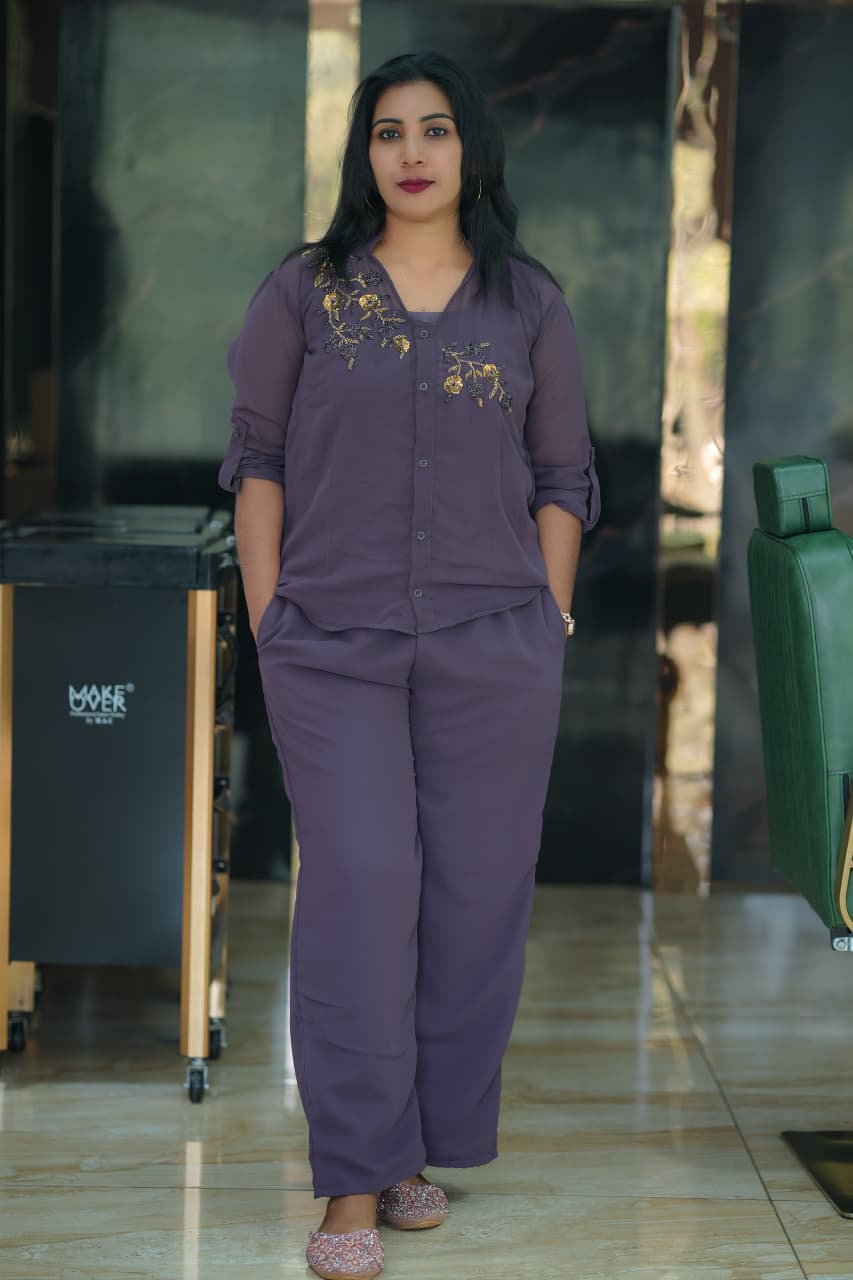 ✨🔥Fabric Georgette PARTY WEAR Cord set..shirt,Pant and Inner set (Hand work)