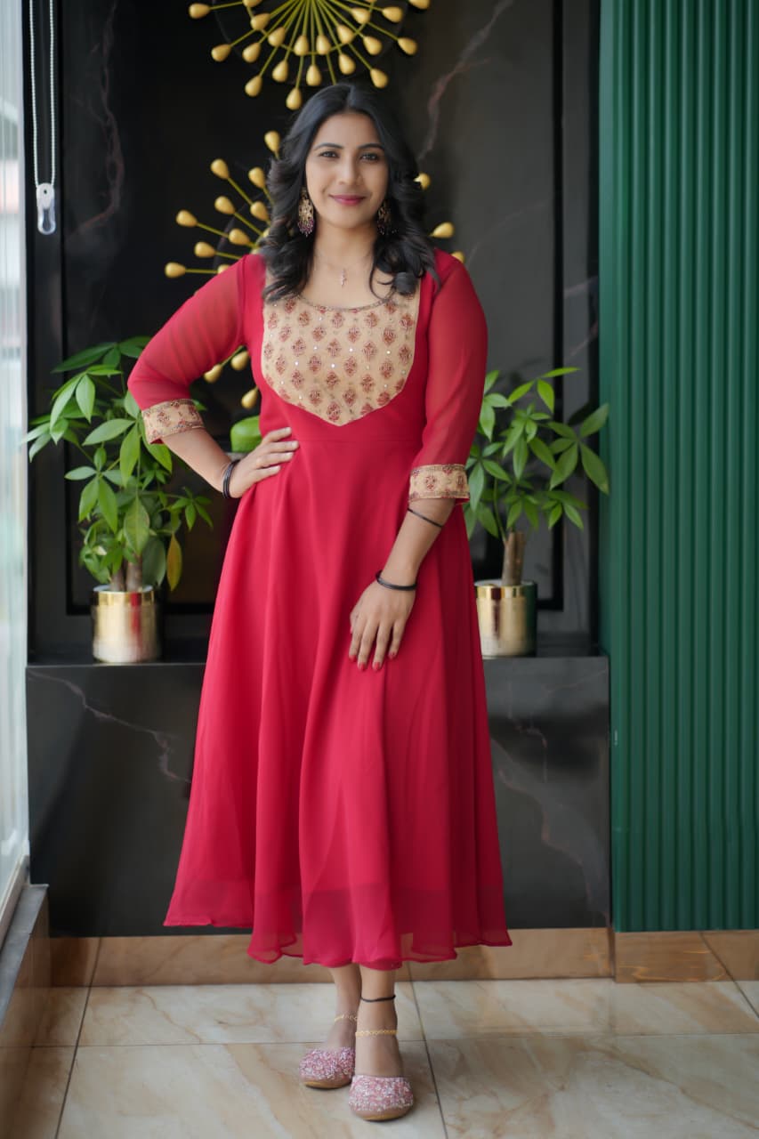 ✨🔥Fabric Georgette Umbrella Kurthi #Handwork#YOKE&SLEEVES #sugarbeads#sequence#cutbeads#stones#
